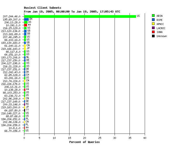 These graphs show that a single /24 network is responsible for a significant amount of the traffic. About 1700 queries/second averaged over the first 17 hours of Jan 19th! Or 35% of all queries received during that period.