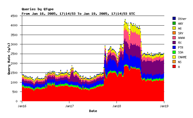 On Jan 18th, our DNS root server measurements showed a sudden increase in traffic. It lasted for a little more than two days. Note in the graph below that about 12 hours after the initial spike, there is another increase. The second increase is mostly in MX, AAAA, and A6 records. The AAAA/A6 queries are for [a-m].root-servers.net, because those records timed out of the clients caches after not getting any responses for 12 hours.